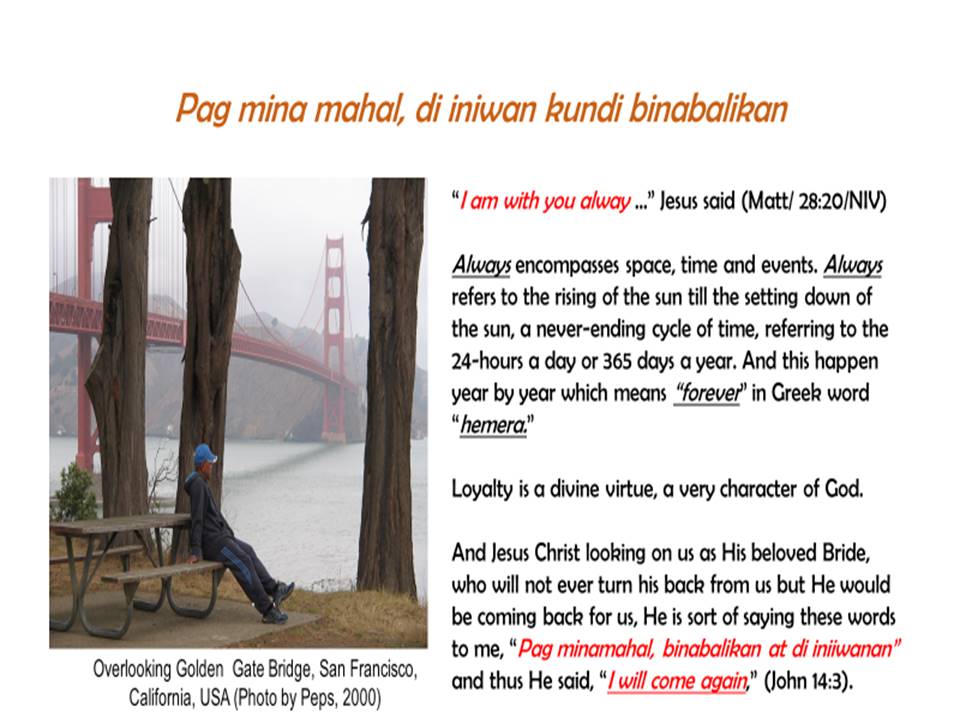 And Jesus Christ looking on us as His beloved Bride, who will not ever turn his back from us but He would be coming back for us, He is sort of saying these words to me, “Pag minamahal, binabalikan at di iniiwanan” and thus He said, “I will come again,” (John 14:3).