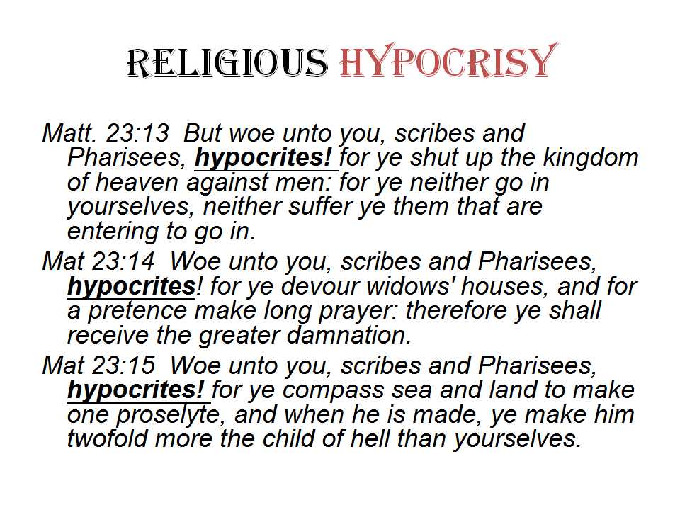 Hypocrisy in various forms is Scriptural. It could be acting in the form of giving (Matthew 6:2); or in prayer (Matthew 6:5); in fasting (Matthew 6:16); in faith relating to the signs of God (Matthew 16:3); with the Herodians-like in public service to the public servants; religious hypocrisy (Matthew 23:14); doctrinal hypocrisy (Luke 12:1; 1 Tim. 4:2); verbal hypocrisy (1 Tim. 4:2); human knowledge (James 3:17).