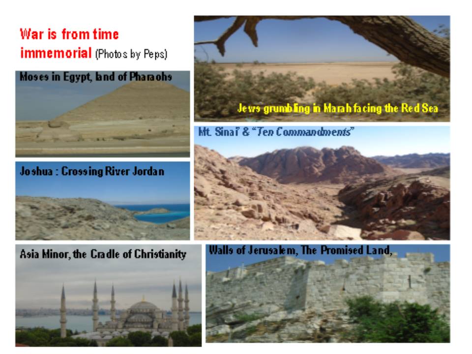 By the time that a man of faith named Abram was called to become a peculiar holy nation, he was misguided and went to Egypt instead. There he lied to the king saying that Sarai was his sister to save his own skin. Eventually he headed to the Promise Land. When famine struck the land, he again sought Egypt as his refuge. Until Joseph, the dreamer was born and became the most powerful man on earth, only next to Pharaoh. Joseph and his people multiplied exceedingly that next king of Egypt who knew not Joseph put the people of Israel in great bondage. It is from there that Moses was called and war between him and the Pharaoh began. When Moses brought his people out from Egypt crossing the Red Sea, the charioteers from Egypt pursued them. But God delivered them. The Jews were bodily set free from slavery but their minds were still made captive by the lures of Egypt. They grumbled against God because of water-issue leavings thousands dead in the wilderness. Due to stubbornness of their hearts many didn’t make it. By the time Joshua and Caleb and their generation crossed the River Jordan they have to pursued against the Jebusites, Canaanites, Amalekites and others to possess the land. The books of Joshua, 1 Kings and 2 Kings has a rich record of history of wars.