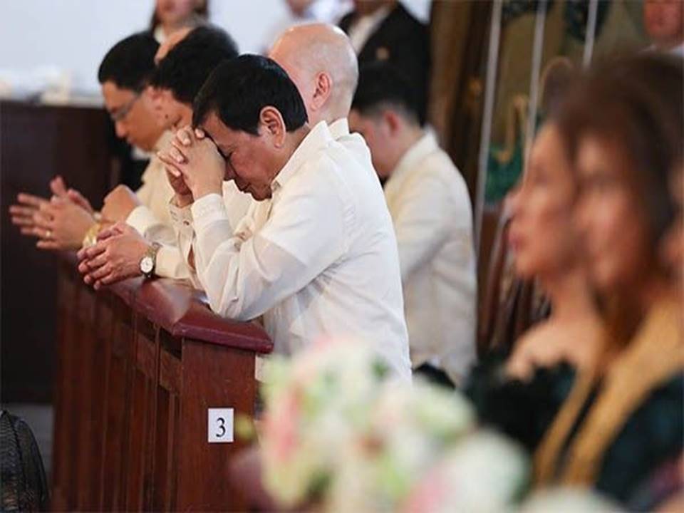 President Rodrigo Duterte prays during the mass at the wedding of Waldo and Regine Carpio at San Agustin Church in Intramurous, Manila on September 16, 2017. - King Rodriguez/PPD, file